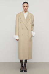 Double-breasted tailored coat in washed double-faced cashmere with peak lapel, slant welt pockets, and horn button closure.