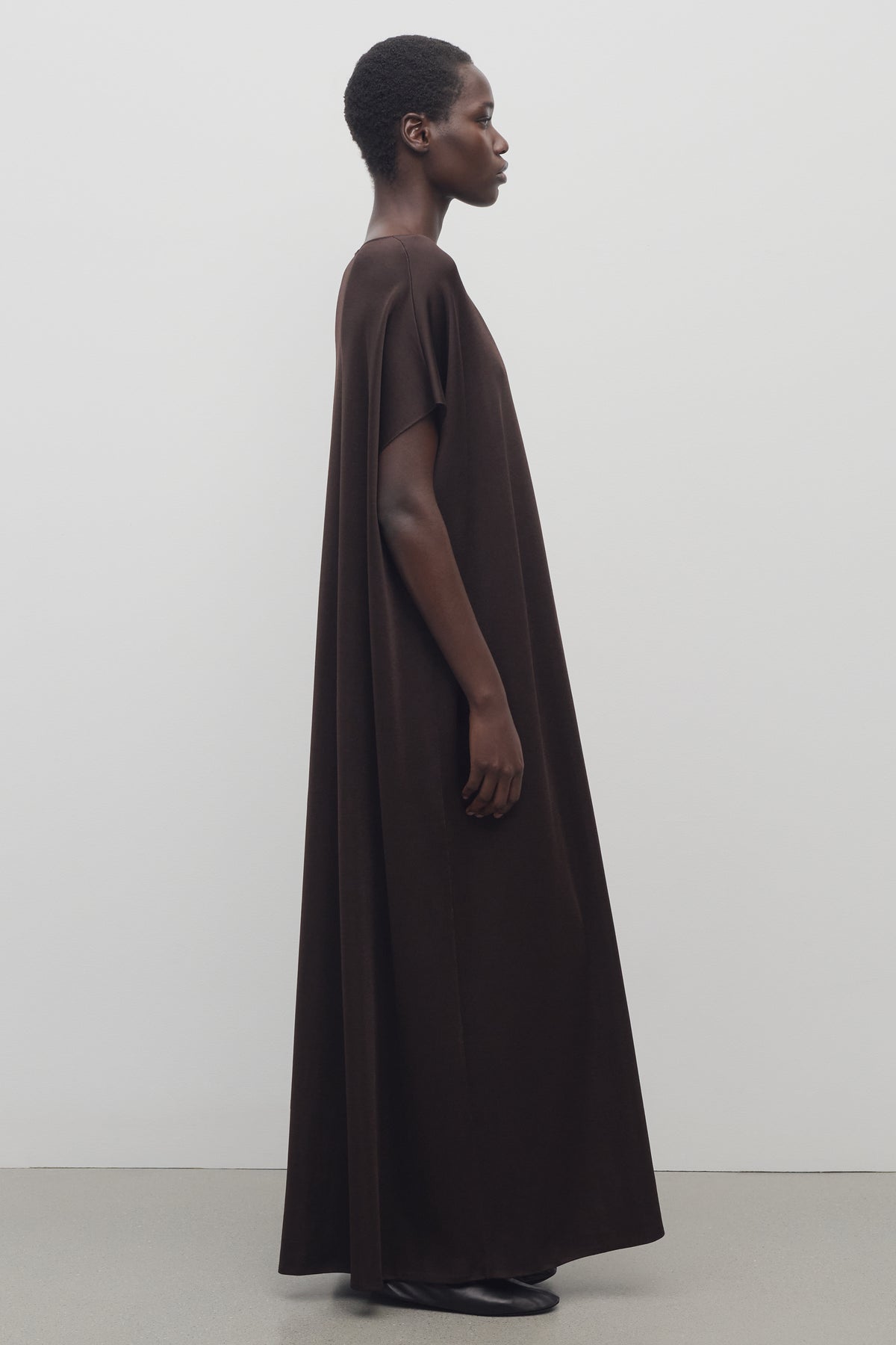 Ankle-length column dress in fluid viscose jersey with minimal silhouette and oversized fit.