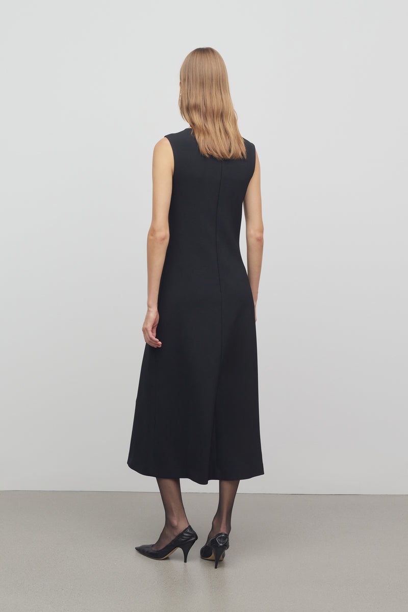 Robe sans manches longueur mi-mollet en crêpe viscose fluide, fabriquée à la main avec jupe trapèze, encolure arrondie et jupon en organza à taille élastiquée.