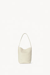 Classic tote bag in grained calfskin leather with interior tie closure and flat handle.