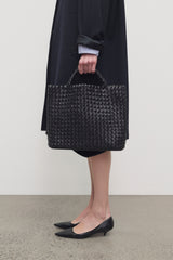 수작업으로 제작한 우븐 가죽 소재의 토트 백. 심리스 구조, 튜브형 핸들, 평평한 밑면, 탈착 가능한 내부 가죽 파우치. 베지터블 태닝 가죽의 독특한 직조 방식으로 미니멀한 실루엣에 은은한 질감을 더한 아이템. 천연 염색 공정으로 시간이 지나고 사용할수록 색상과 질감이 점차 변화하며 깊어지는 가죽.