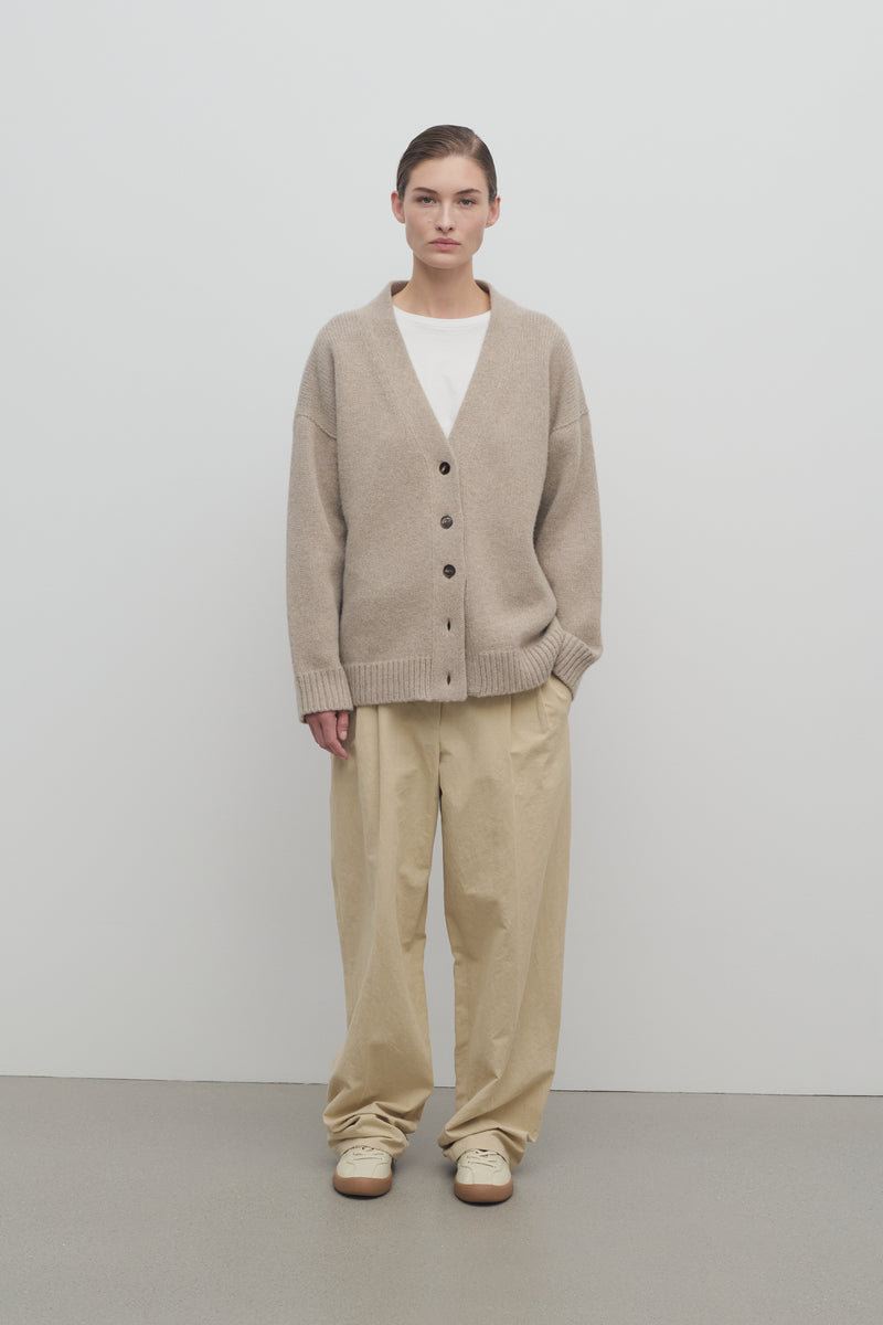 재패니즈 코튼 및 리넨 개버딘 소재의 하이 라이즈 테일러드 팬츠. 스트레이트 레그, 앞면 더블 플리츠, 옆면 웰트 포켓.