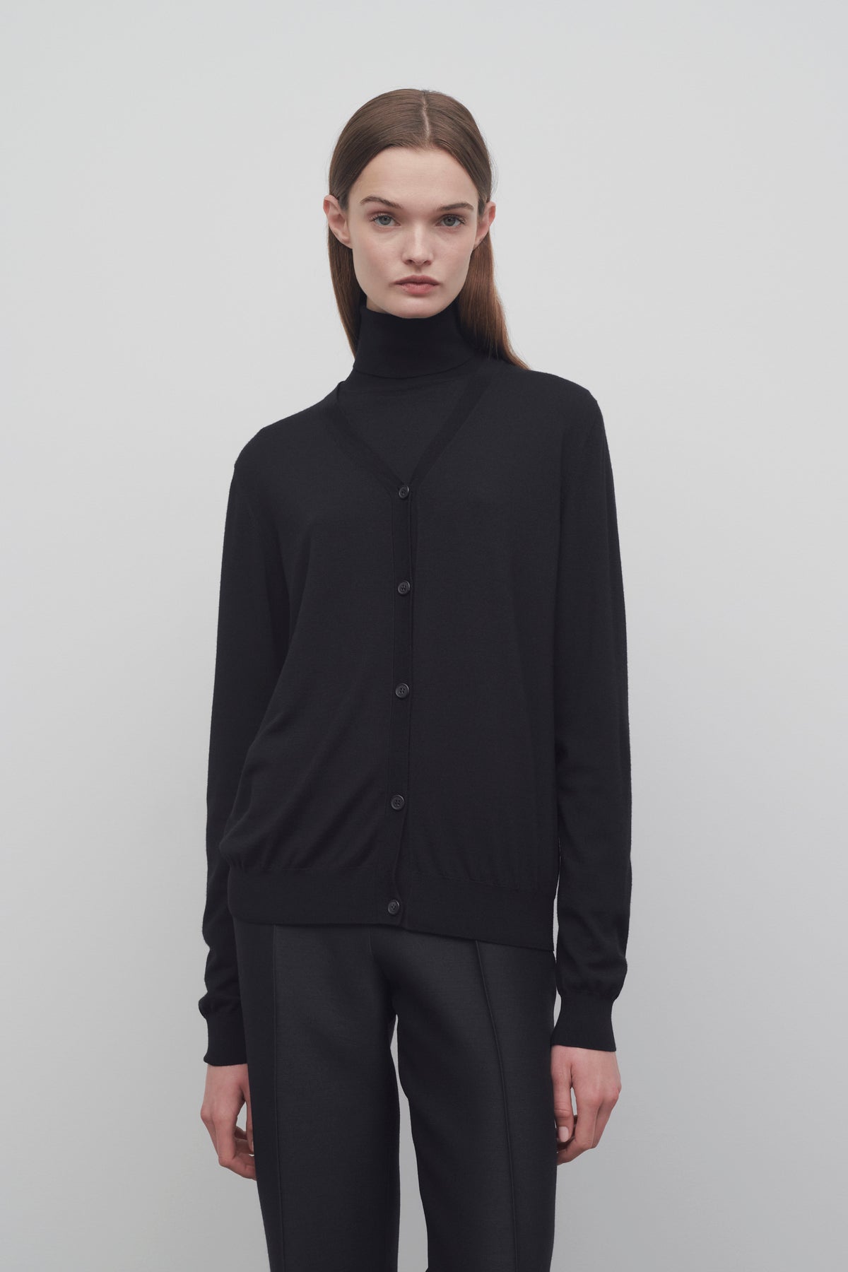 长袖开衫,采用超细羊毛平纹针织面料,配以 V 领、牛角扣开合、以及精细罗纹领口、袖口和下摆设计。